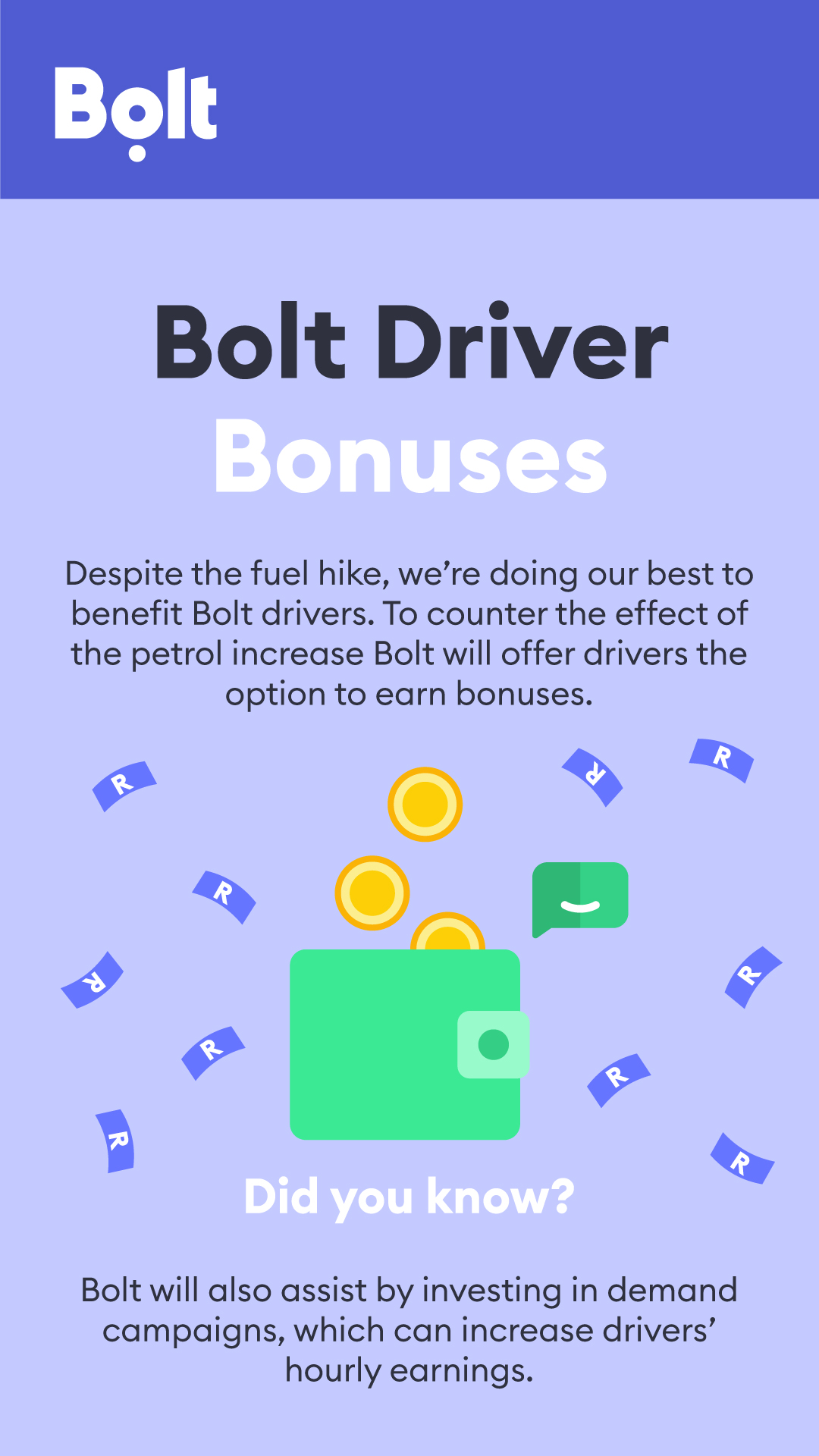 Luckily for them, we were there to help. We developed a quick but beautiful set of decks in the Bolt CI, which allows them to send urgent comms, or regular updates, to their South African driver base of over 35 000 people. To date, we have created 34 sets of communication decks for Bolt.