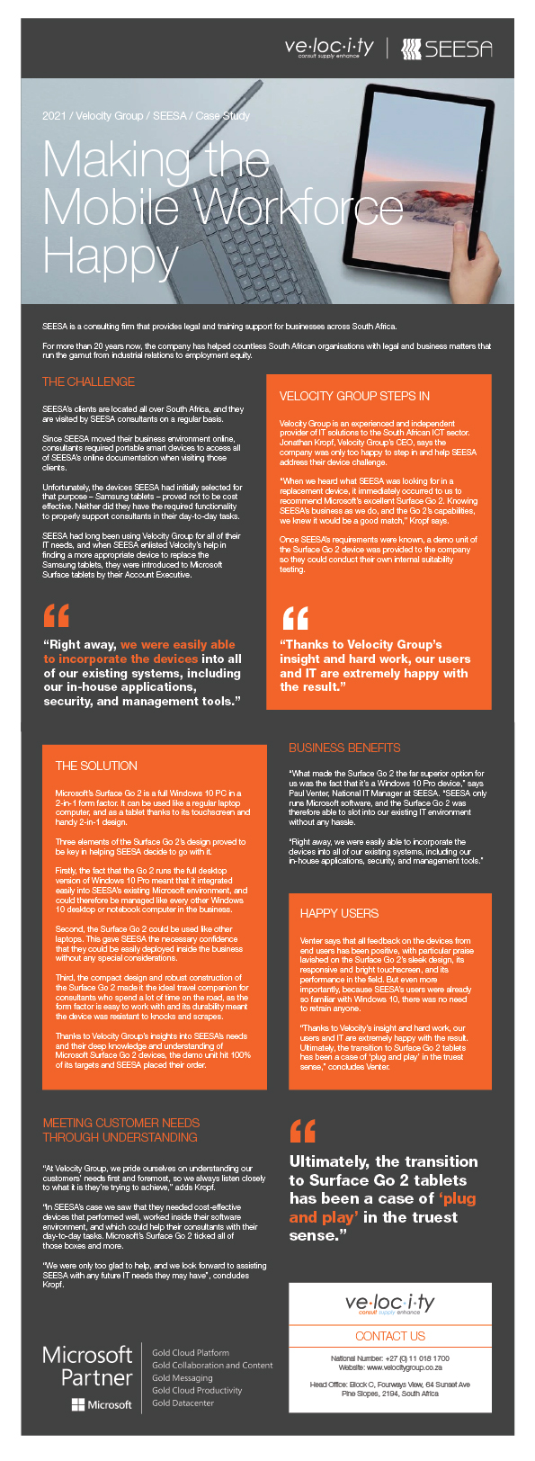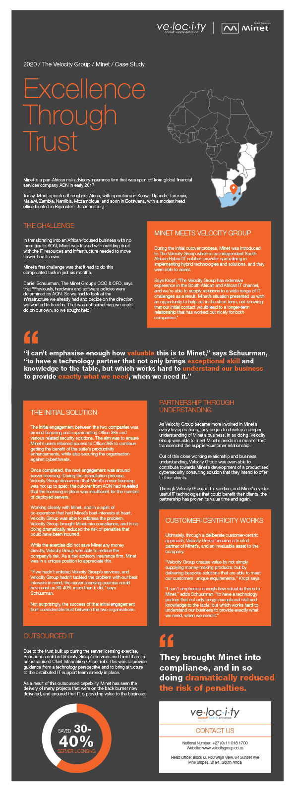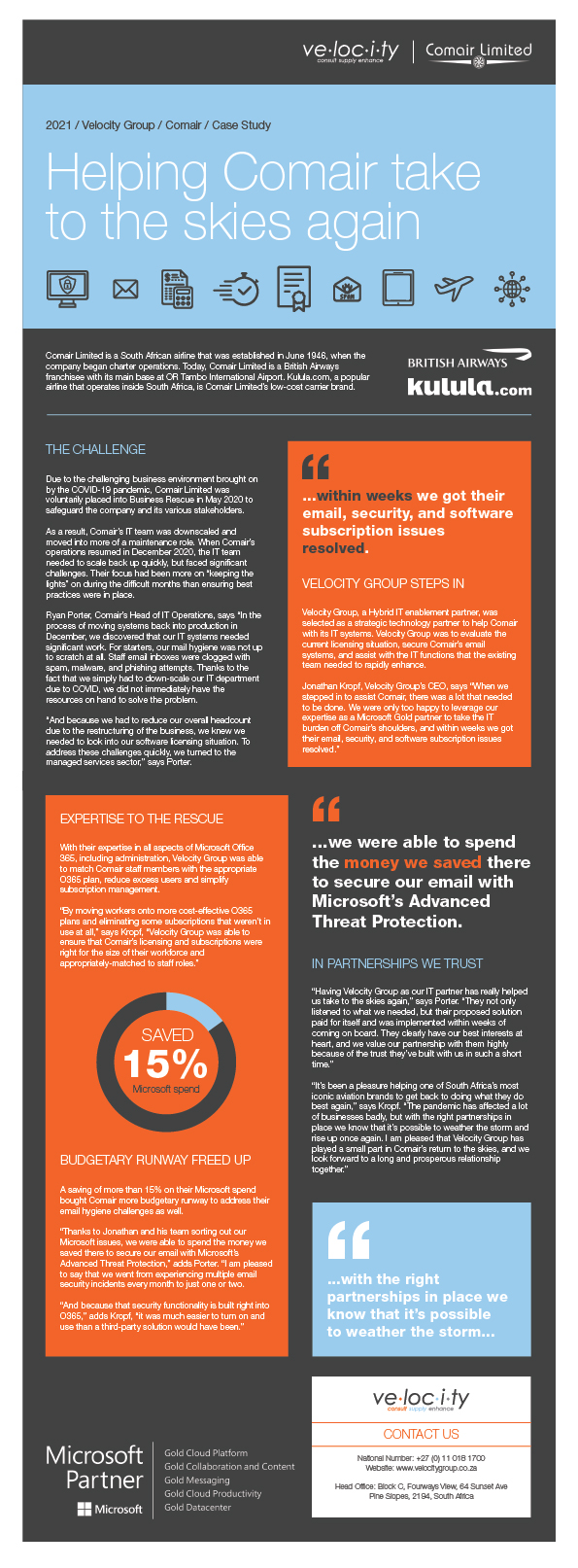 Velocity Group is a managed IT service provider based in Johannesburg specialising in hybrid cloud solutions that use Microsoft technologies such as the Azure cloud. They also offer custom deployments of everything inside the Microsoft 365 stack, tailored to the client’s needs.